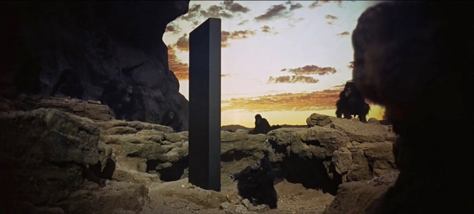 A l'aube de l'Humanité, dans le désert africain, une tribu de primates subit les assauts répétés d'une bande rivale, qui lui dispute un point d'eau. La découverte d'un monolithe noir inspire au chef des singes assiégés un geste inédit et décisif. Brandissant un os, il passe à l'attaque et massacre ses adversaires. Le premier instrument est né.